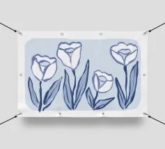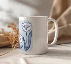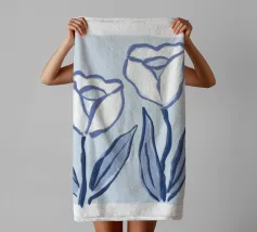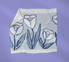 Una rilassante opera d'arte astratta con tulipani bianchi con accenti blu e fogliame, su uno sfondo azzurro, perfetta per un'estetica pacifica e moderna.
