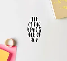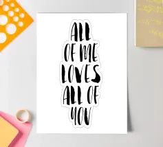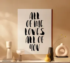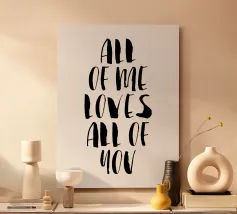 Celebrate l'amore nella sua forma più pura con la nostra incantevole stampa tipografica "All of Me Loves All of You". Questo accorato messaggio, reso con caratteri acquerellati neri su uno sfondo bianco, cattura l'essenza dell'amore incondizionato. Le delicate pennellate aggiungono un tocco artistico ed emotivo a questa dichiarazione senza tempo. Perfetto per camere da letto, spazi abitativi o come regalo di nozze, questo disegno versatile è disponibile anche su diversi prodotti lifestyle. Lasciate che questo bellissimo sentimento vi ricordi ogni giorno il potere e la bellezza di un amore completo e incondizionato.