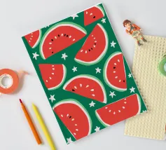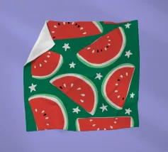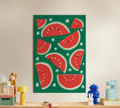 Il design astratto dell'anguria, ornato da stelle scintillanti, crea un'atmosfera estiva giocosa e rinfrescante, mescolando le immagini del frutto succoso con un tocco di magia celeste, un tocco di divertimento e meraviglia.