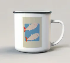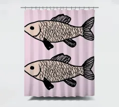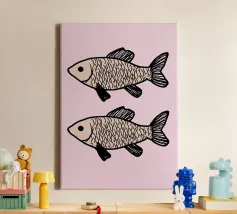 Due pesci identici con squame dettagliate sono raffigurati su uno sfondo rosa tenue. I loro semplici contorni neri e i toni neutri creano un look giocoso e stilizzato.