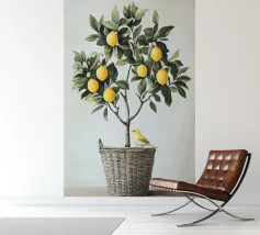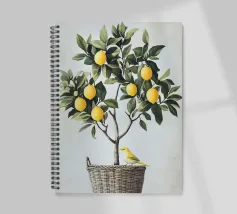 Un uccello giallo siede su un albero di limoni, circondato da agrumi freschi e fogliame rigoglioso. Questa illustrazione minimalista di natura morta mediterranea combina la bellezza della natura con un tocco di stile boho.