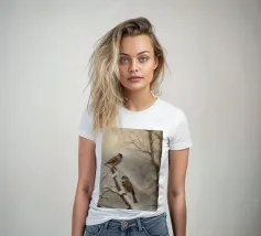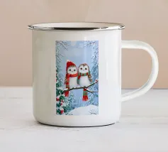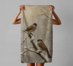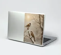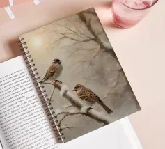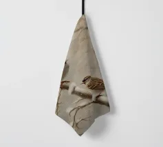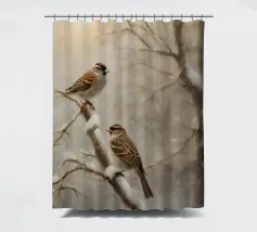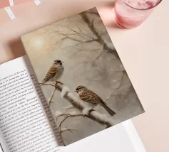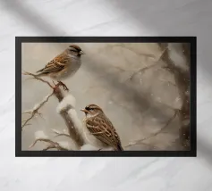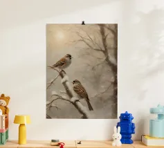 Due uccellini siedono su rami innevati in un tranquillo paesaggio invernale, simbolo di pace e armonia nella stagione fredda. Questo romantico motivo naturalistico cattura la bellezza dell'inverno ed è perfetto per murales, tazze, cuscini o decorazioni stagionali.