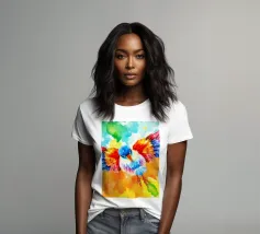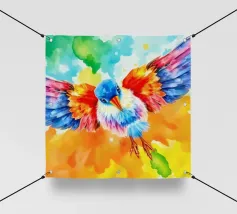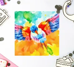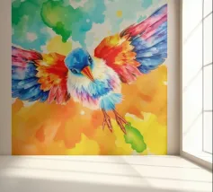 Un uccello vivace con un mix di piume blu, rosse e gialle si libra nell'aria, circondato da una serie di motivi astratti colorati e tonalità tenui.