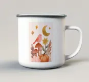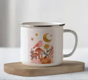 Una sognante illustrazione boho di un uccello rosa appollaiato tra morbidi funghi sotto una luna dorata e stelle. Circondata da fiori pastello e fogliame autunnale, questa delicata opera d'arte celebra la magia della natura e la calma celeste. Perfetta per le camerette, le camere da letto o gli interni accoglienti, combina la morbidezza dell'estetica coquette con il calore della serenità dei boschi: un tocco pacifico di arte naturale femminile.