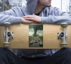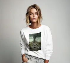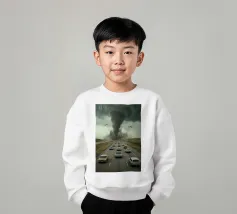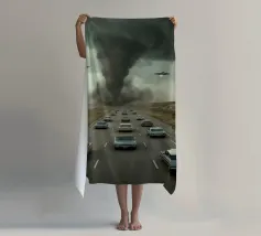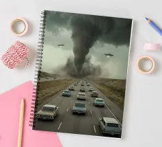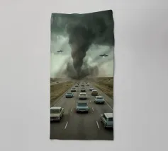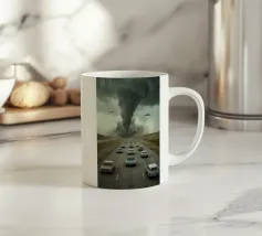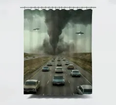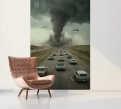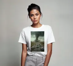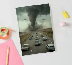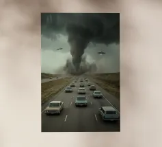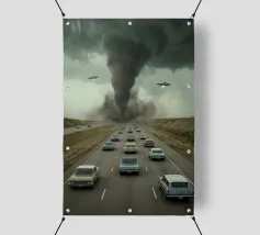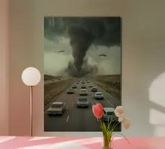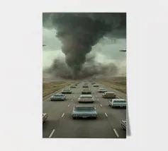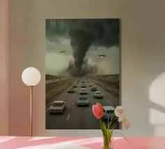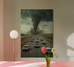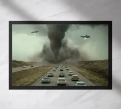 Questa drammatica opera d'arte surreale cattura un agghiacciante momento apocalittico in cui un enorme tornado attraversa un'autostrada aperta mentre misteriosi UFO si librano silenziosamente sopra di essa. Le auto d'epoca si dirigono verso la tempesta, creando un potente contrasto tra la vita quotidiana, il disastro naturale e la presenza extraterrestre. La composizione cinematografica evoca temi di invasione aliena, caos, mistero fantascientifico e futuro distopico. Perfetto per gli amanti dell'arte surreale, della fantascienza, delle immagini UFO e delle decorazioni murali cinematografiche dark, questo disegno si impone con forza negli interni moderni e negli studi.