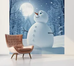 Un pupazzo di neve si gode la notte invernale, circondato da una foresta innevata illuminata dal bagliore della luna piena, creando un'atmosfera serena e magica.