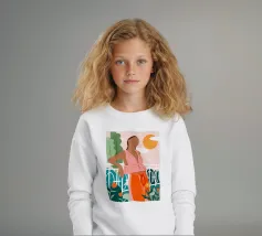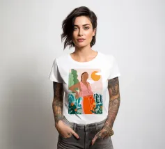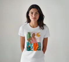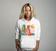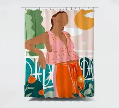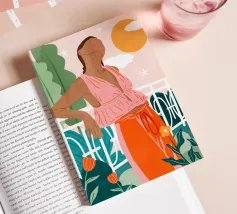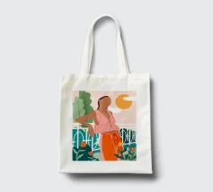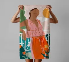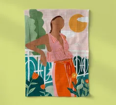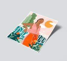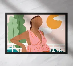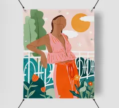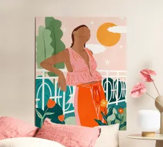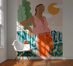 Una donna si appoggia all'indietro, immergendosi nella calda luce del sole, circondata da una vegetazione rigogliosa e da fiori in fiore. I tenui colori pastello e gli audaci arancioni creano un'atmosfera estiva sognante e rilassata. La scena cattura un momento di tranquillità, calore e bellezza senza sforzo.