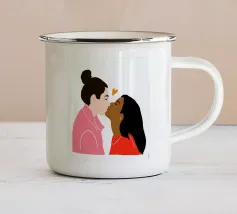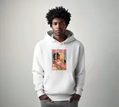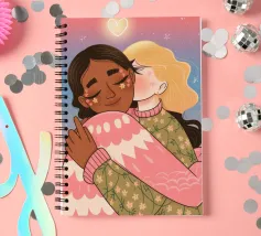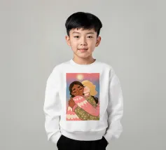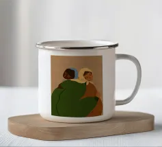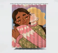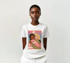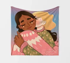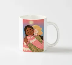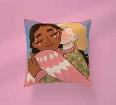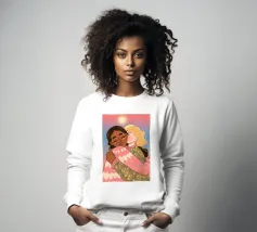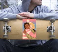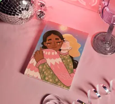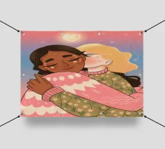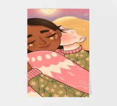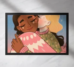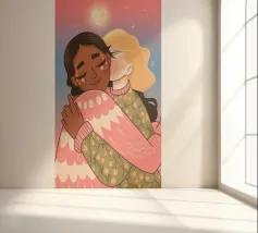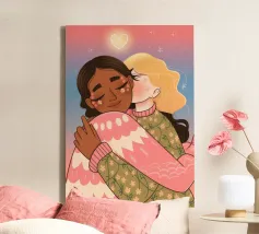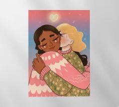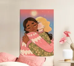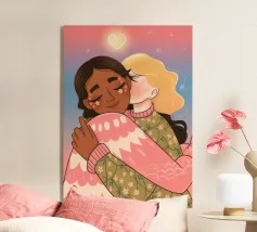 Questa opera d'arte mostra due persone che si abbracciano, con uno sfondo rosa e il simbolo di un cuore sopra di loro. I colori caldi e la posa affettuosa trasmettono un senso di amore e calore.