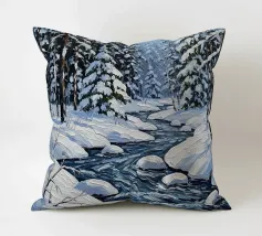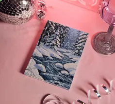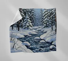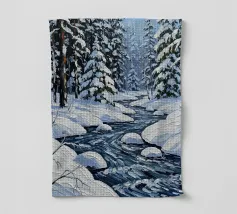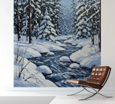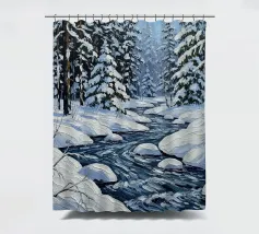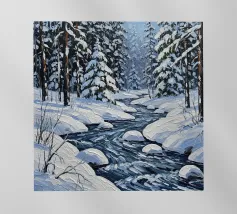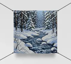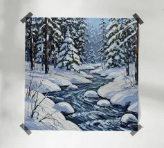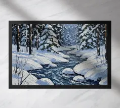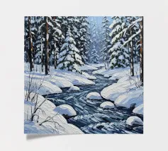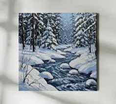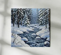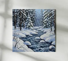 Questo dipinto a olio, unico nel suo genere, cattura la serena bellezza di un paese delle meraviglie invernale con un vibrante stile impressionista. Le pennellate spesse ed espressive danno vita alla scena, mettendo in risalto la soffice e pesante coltre di neve che ricopre i sempreverdi e le rocce. Un fiume tortuoso, dipinto con ricchi blu e bianchi, scorre nel cuore del paesaggio, il cui movimento è un contrasto dinamico con la quiete della foresta circostante. Questo pezzo è perfetto per aggiungere un tocco di natura pacifica e una texture sofisticata a qualsiasi spazio.