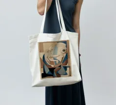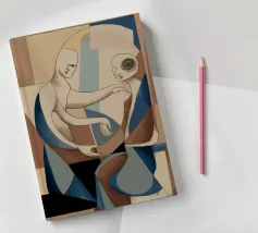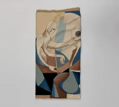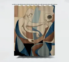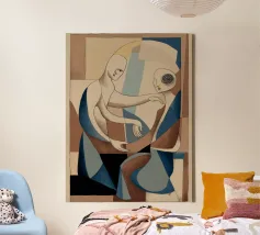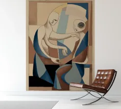 Questo dipinto presenta figure astratte in una posa intima, utilizzando i toni del beige, del blu e del marrone. Le forme e le linee trasmettono un senso di connessione e vicinanza.