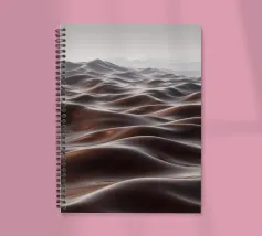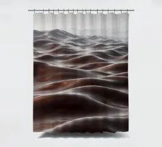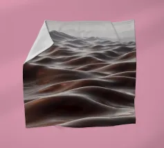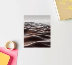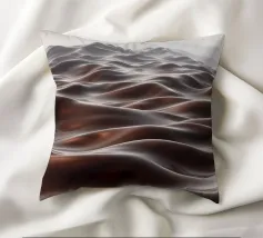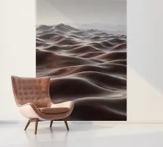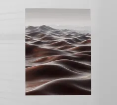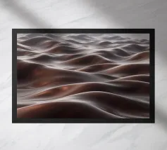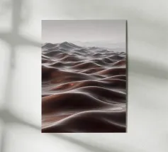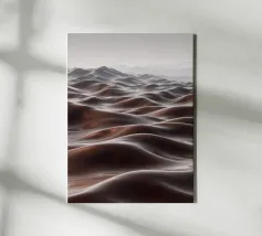 Un paesaggio astratto in cui fluenti onde metalliche di bronzo e rame brillano sotto un cielo nebuloso. Le forme organiche e ondulate evocano un senso di movimento fluido e di serena contemplazione, fondendo l'asprezza di un deserto con la liscia eleganza di una superficie metallica fusa.