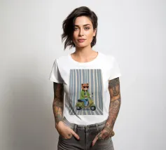 Aggiungete un tocco di divertimento e personalità alle vostre pareti con questa giocosa illustrazione di un elegante orso che sfreccia su uno scooter con occhiali da sole e giacca verde. Perfetto per gli amanti degli animali, per le camere dei bambini o per tutti coloro che amano le opere d'arte moderne e stravaganti. Questo pezzo unico trasmette un'atmosfera allegra ed è anche un ottimo regalo.