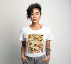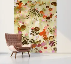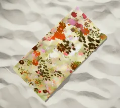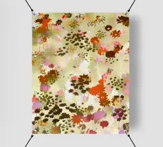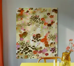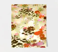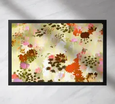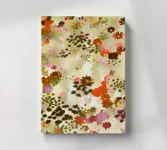 Questo dipinto è una rappresentazione vibrante e astratta di un prato in fiore, pieno di fiori selvatici nei toni caldi e terrosi del rosso, dell'arancio e del rosa. I fiori sono sparsi su uno sfondo morbido e luminoso di verdi e gialli pallidi, che evoca la sensazione della luce del sole che filtra attraverso un campo lussureggiante. Il gioco di luci e ombre crea un'atmosfera sognante, quasi eterea, con le forme floreali che si fondono perfettamente con lo sfondo. La composizione cattura l'essenza della bellezza della natura in uno stile dinamico ed espressivo, celebrando il fascino fugace di un giardino illuminato dal sole.