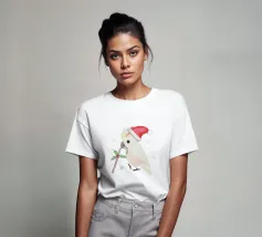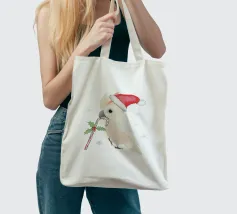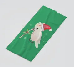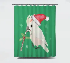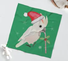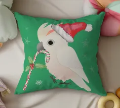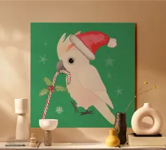 Illustrazione vettoriale digitale di un simpatico cacatua dalla cresta salmonata. Indossa un cappello natalizio e tiene in mano una caramella decorata con agrifoglio.