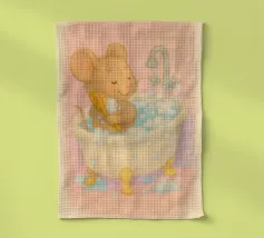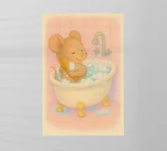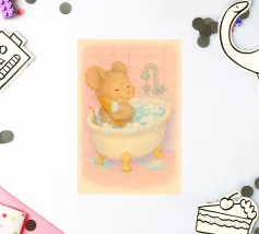 Un momento di puro relax: questa illustrazione, disegnata con amore, mostra un topolino che fa un bagno accogliente, con gli occhi chiusi, circondato da acqua calda e delicate bolle di sapone. Lo stile morbido dell'acquerello e i colori pastello conferiscono al motivo un'atmosfera calma e sicura, piena di leggerezza, e l'immagine parla della cura di sé, del benessere e dei piccoli momenti di felicità nella vita quotidiana. Giocoso e rilassante, invita a fermarsi e ad assaporare il momento.