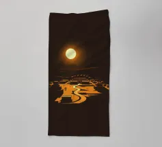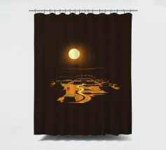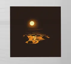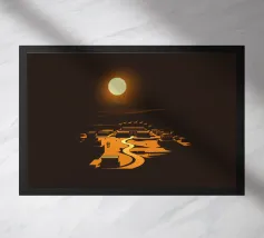 Quando il sole tramonta, emerge un villaggio tranquillo con sentieri tortuosi e sagome di persone che passeggiano, creando un ambiente calmo e sereno.