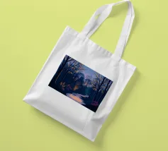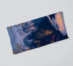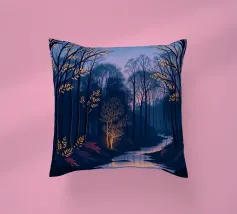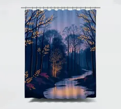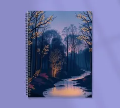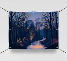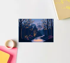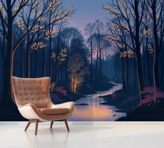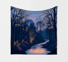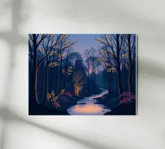Questa accattivante opera d'arte vi trasporta in una foresta serena e mistica al tramonto. Un fiume tranquillo, illuminato dalle ultime vestigia di luce dorata, serpeggia con grazia attraverso una fitta chioma di alberi secolari. La scena è immersa in una tavolozza di blu e viola profondi, che creano un'atmosfera di pace e meraviglia. Le foglie rade e luminose sui rami e il fogliame viola vibrante lungo le rive aggiungono tocchi di calore magico e di intrigo, invitando lo spettatore a entrare in questo mondo incantevole in cui la bellezza e il mistero della natura si intrecciano. È un'opera perfetta per chiunque voglia portare un senso di