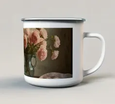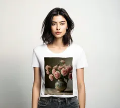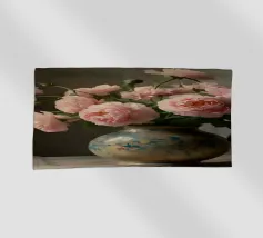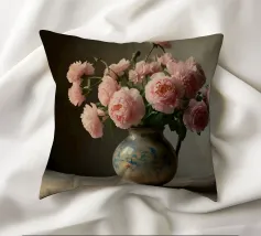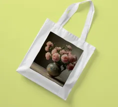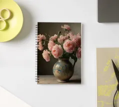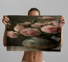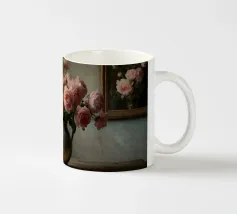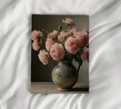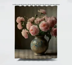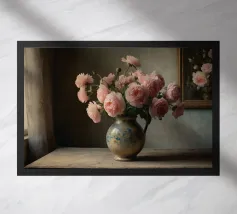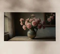 Un bellissimo bouquet di peonie rosa è adagiato in un vaso rustico su un tavolo di legno. La luce naturale filtra da una finestra vicina, illuminando i delicati petali in un ambiente accogliente.