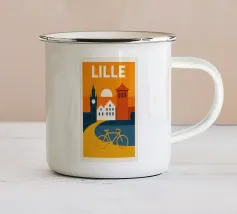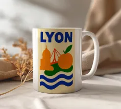 Poster stilizzato di Lione con un gigantesco frutto arancione, la silhouette di una basilica e di un ponte, su uno sfondo di onde blu e verde. I colori vivaci e le forme semplici evocano manifesti retrò, celebrando al contempo il Rodano e l'atmosfera gastronomica della città. Un omaggio grafico e allegro alla capitale della Gallia.