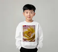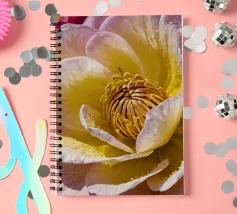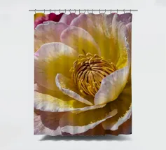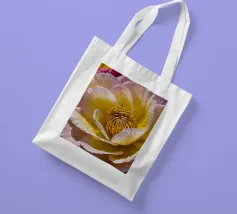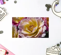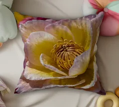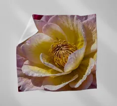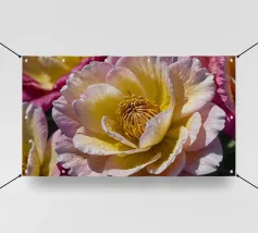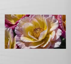 Una splendida camelia dai petali gialli e rosa, che prospera in un giardino soleggiato in primavera. Il centro intricato ne accresce la bellezza.