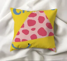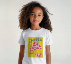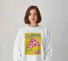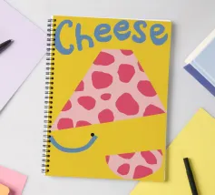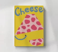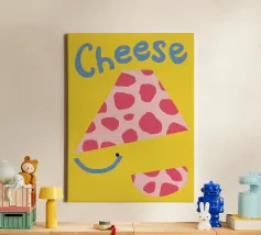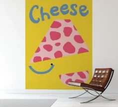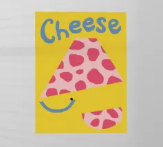 Un'illustrazione grafica e giocosa con una fetta di formaggio, completa di buchi, su uno sfondo giallo con la parola "CHEESE" in grassetto. Un divertente tributo pop art a un alimento molto amato.