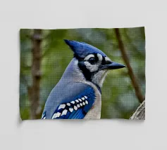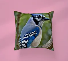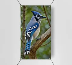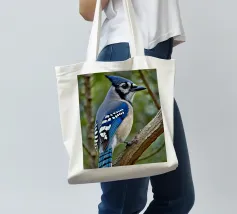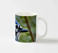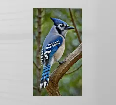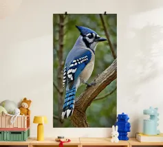 La ghiandaia azzurra siede con grazia su un ramo robusto, con le sue piume bianche e blu che contrastano con lo sfondo del fogliame verde nella luce del mattino.