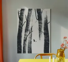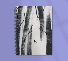 Una figura solitaria e un cagnolino si ergono tra alberi imponenti, creando un senso di scala e introspezione. La tavolozza monocromatica e il netto contrasto sottolineano la serenità e la profondità della scena della foresta.