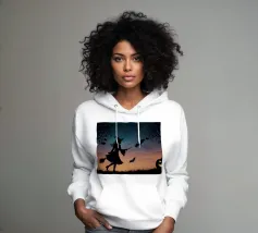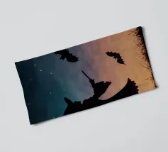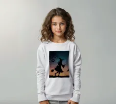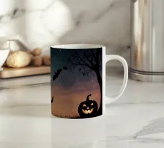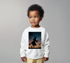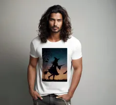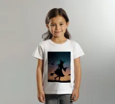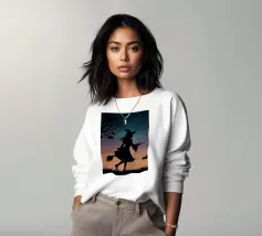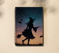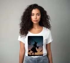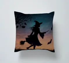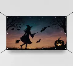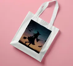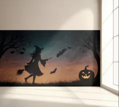 Al calare del crepuscolo, una strega in silhouette vola a cavallo della sua scopa tra i pipistrelli, con una zucca incandescente in primo piano, creando un'atmosfera incantevole.