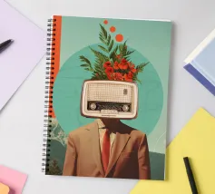 Collage digitale surrealista. Una persona in abito marrone con cravatta rossa ha una radio antiquata al posto della testa. Dalla parte superiore della radio spuntano fiori rossi e foglie verdi. Tre punti rossi fluttuano in alto. Lo sfondo è caratterizzato da un cerchio turchese con una mappa, una striscia verticale rossa a sinistra, montagne e foreste in basso e un cielo limpido a destra.