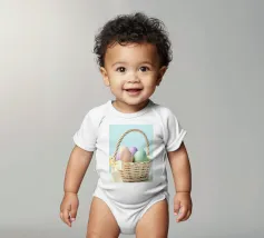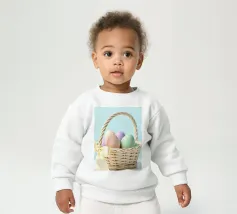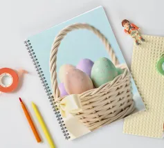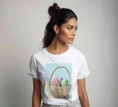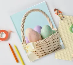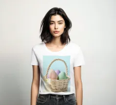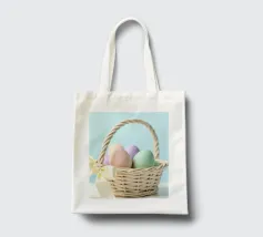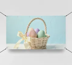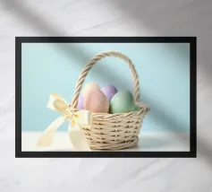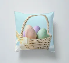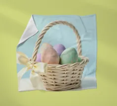 Un bellissimo cesto intrecciato pieno di uova dai colori pastello si trova su un tavolo. Il cestino è legato con un nastro delicato, che crea un'atmosfera festosa per le festività pasquali.