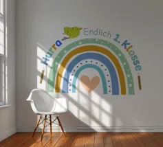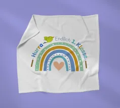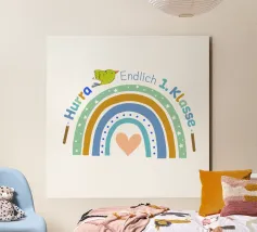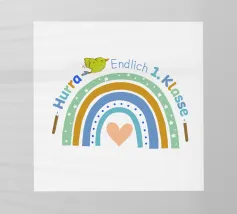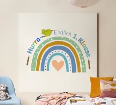 L'inizio della scuola è qualcosa di molto speciale. Tutti gli scolari lo attendono con ansia. Questo delizioso motivo per l'inizio della scuola la rende ancora più divertente e piacevole. Un simpatico arcobaleno in stile boho nei toni del blu e del verde, abbinato a un caldo giallo ocra. Inoltre, matite colorate e lettere colorate. È incluso anche un simpatico uccellino cinguettante. Per i bambini. Naturalmente anche per le ragazze, se amano il blu.