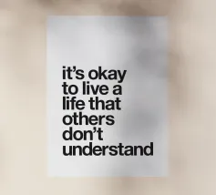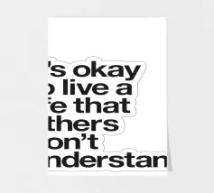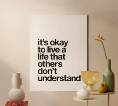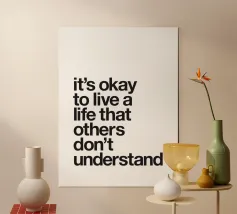 Questo design di grande impatto è caratterizzato da una nitida scritta Helvetica nera su uno sfondo bianco pulito, che crea una dichiarazione visiva audace e senza tempo. Perfetta per gli spiriti liberi, gli anticonformisti e tutti coloro che tracciano la propria strada, questa opera d'arte versatile aggiunge un tocco di forza a qualsiasi spazio. Lo stile minimalista fa sì che il potente messaggio risalti e serva da promemoria quotidiano per rimanere fedeli a se stessi. Lasciate che questo pezzo accattivante ispiri fiducia nelle vostre scelte, trasformando il vostro ambiente in un santuario dell'accettazione di sé e della propria individualità.