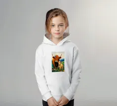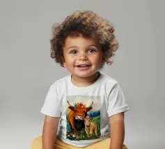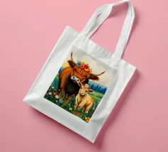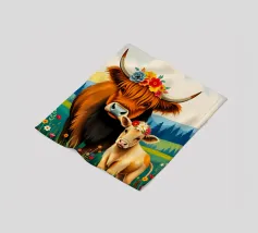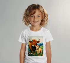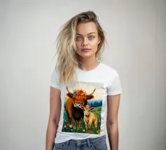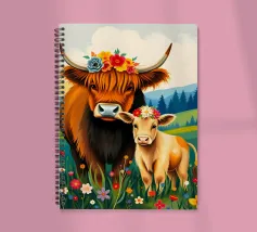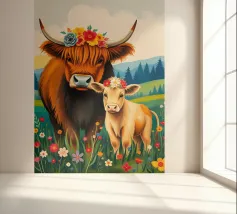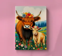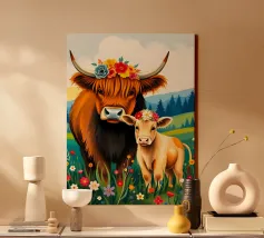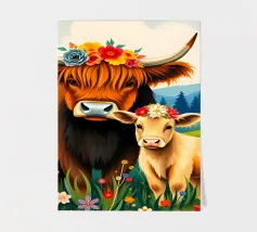 Simpatiche mucche scozzesi delle Highlands con corone floreali in un prato di fiori selvatici.
