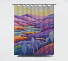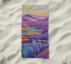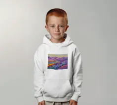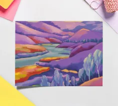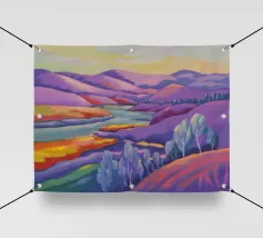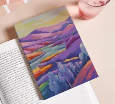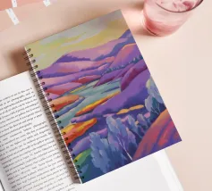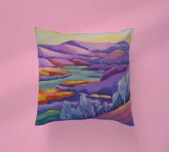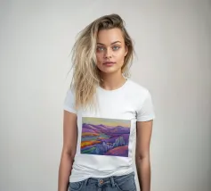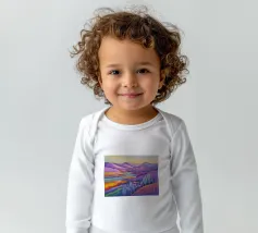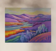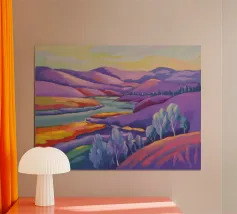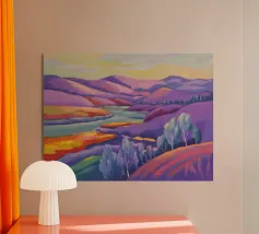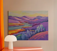Un vibrante dipinto paesaggistico di una valle con campi dai colori vivaci, quasi surreali, come il rosa, l'arancione, il giallo e il viola. Colline ondulate si estendono in lontananza sotto un cielo azzurro e limpido.