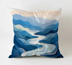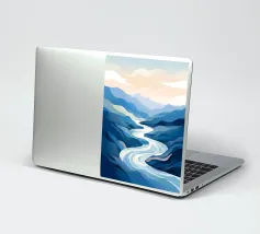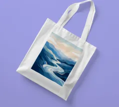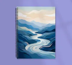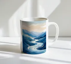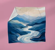 Un rilassante dipinto di paesaggio con un fiume tortuoso che scorre in una valle serena, circondato da maestose montagne e da un cielo tenue e pastello.