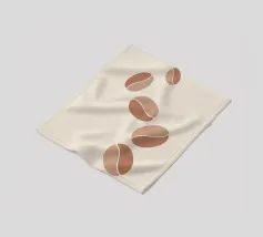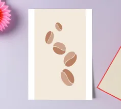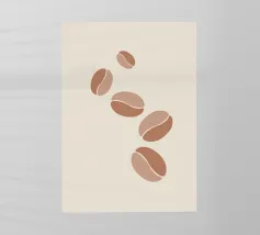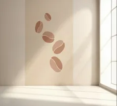 Chicchi di caffè in varie tonalità di marrone sembrano galleggiare su uno sfondo beige chiaro. Lo stile minimalista enfatizza le forme morbide e arrotondate dei chicchi.