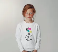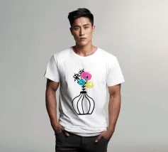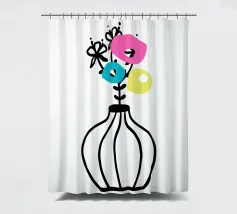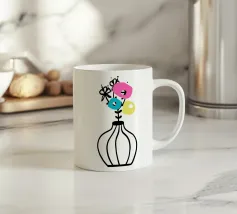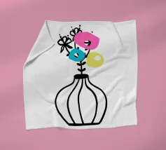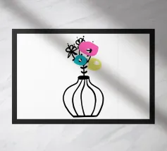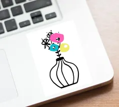 Un vaso stravagante contiene una colorata composizione di fiori astratti, dalle forme audaci e semplici. I contorni neri contrastano con le vibranti tonalità di rosa, blu e giallo, creando un'atmosfera giocosa e moderna.