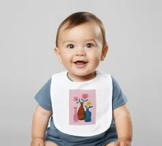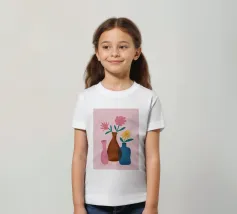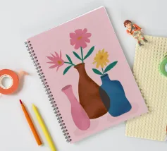 Un'illustrazione minimalista ed elegante di due semplici vasi, uno di terracotta e uno blu, ciascuno con un singolo stelo di fiore su uno sfondo rosa tenue.