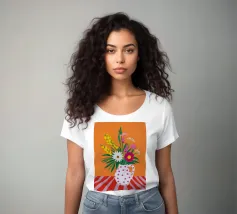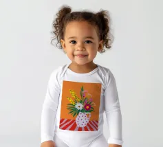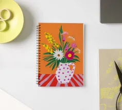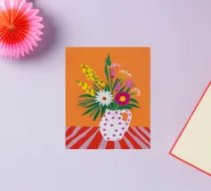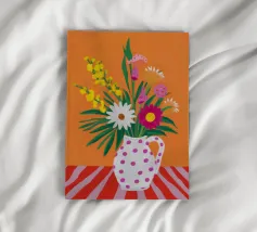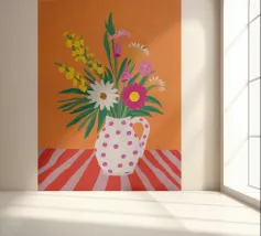 Un vivace bouquet di fiori misti è gioiosamente disposto in un vaso bianco ornato da pois colorati. Lo sfondo è di un arancione brillante, che esalta l'atmosfera allegra e giocosa della composizione floreale.