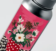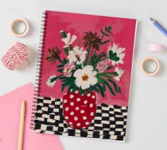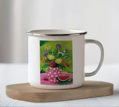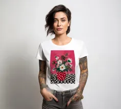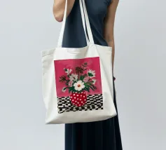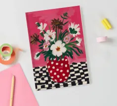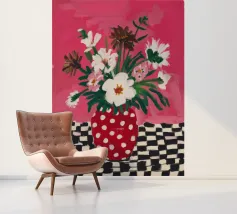 Un vivace bouquet di fiori misti, tra cui spicca una margherita bianca, in un allegro vaso rosso a pois bianchi. La composizione su uno sfondo a scacchi è un'esplosione gioiosa e giocosa di motivi e colori.