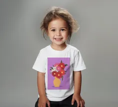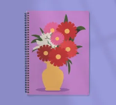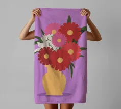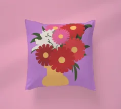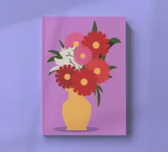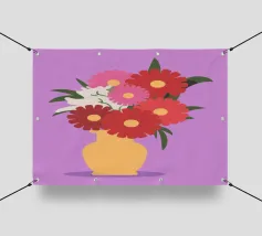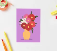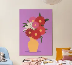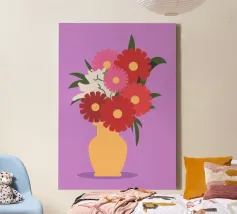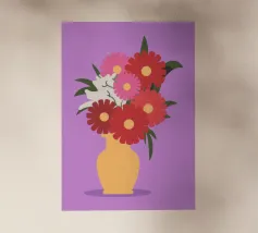 Un dipinto raffigurante un vaso a strisce bianche e nere pieno di fiori arancioni e foglie verdi, su uno sfondo color pesca.