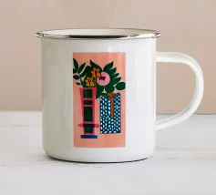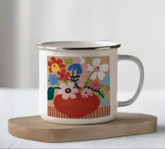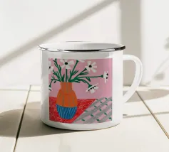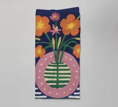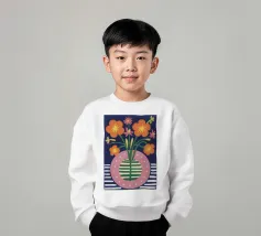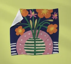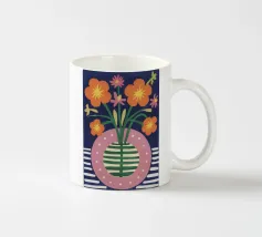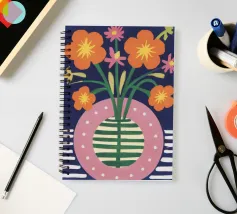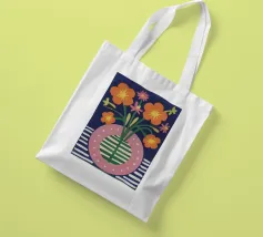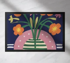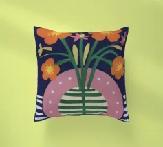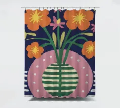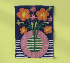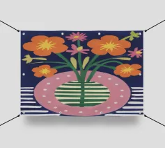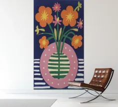 Un allegro bouquet di fiori arancioni in un vaso a righe bianche e rosa. La composizione semplice e i colori giocosi creano un'opera d'arte floreale allegra, affascinante e moderna.