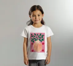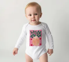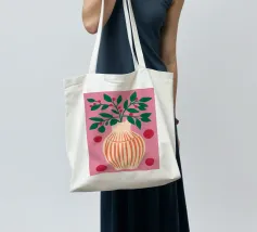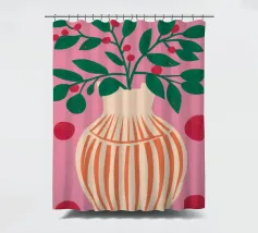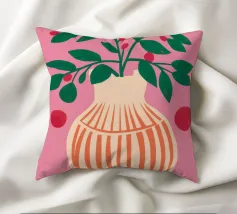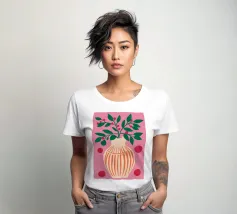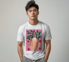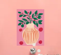 Una natura morta con una pianta rosa frondosa in un semplice vaso a righe. La composizione è un pezzo moderno, minimalista ed elegante, con una tavolozza di colori bella e delicata.