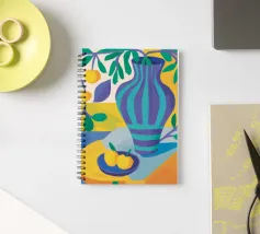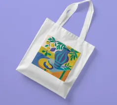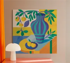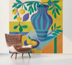 Una vivace natura morta con un ramo di un albero di limoni, carico di frutti e foglie, disposto in un audace vaso a righe viola e blu su uno sfondo giallo pieno.