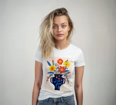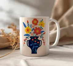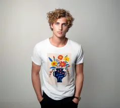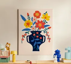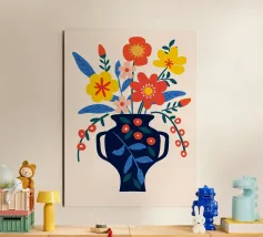 Una vibrante composizione floreale in un elegante vaso blu scuro che cattura il fascino di un giardino estivo. Questo disegno colorato combina il rosso, il giallo e il blu in modo armonioso, portando gioia e freschezza in ogni stanza. Perfetto come murale, tazza o copricuscino - ideale per gli amanti dei motivi floreali e delle decorazioni moderne.