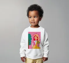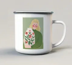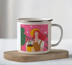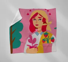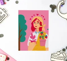 Una donna in abito rosa innaffia un vaso di fiori, con altre piante colorate intorno a lei. La scena è una rappresentazione affascinante, dolce e pacifica della semplice gioia di prendersi cura di un giardino.
