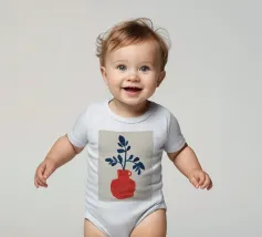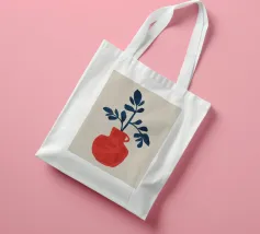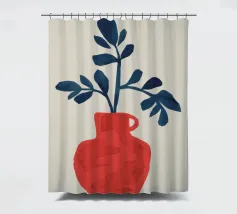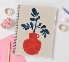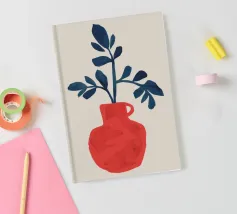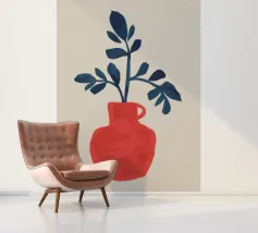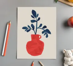 Un'illustrazione semplice ed elegante di una pianta frondosa in un vaso rosso strutturato. La composizione minimalista su uno sfondo beige neutro enfatizza la bellezza della forma della pianta e del colore del vaso.