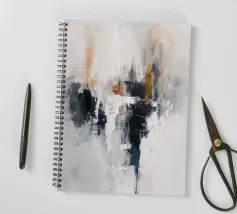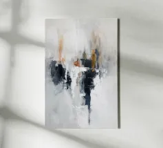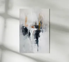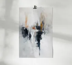 Un astratto minimalista in cui bianchi e grigi tenui si fondono con neri profondi e sottili accenni di arancione bruciato. La composizione è al tempo stesso grezza e raffinata, come se frammenti di memoria si dissolvessero nella luce. I suoi tratti strutturati invitano alla contemplazione, offrendo una presenza silenziosa ma potente che risuona con purezza e profondità.