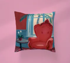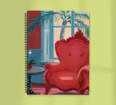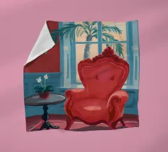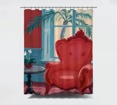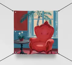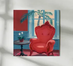 Una lussuosa poltrona wingback in velluto rosso si trova accanto a un'ampia finestra con tende blu, che permette alla luce soffusa di riempire la stanza. Una piccola pianta in vaso con fiori bianchi aggiunge un tocco di vita a questa elegante e tranquilla scena di solitudine.