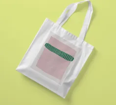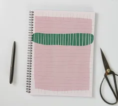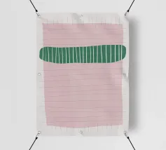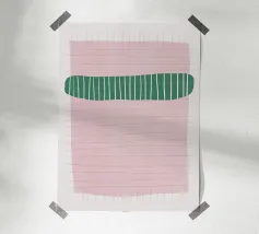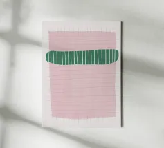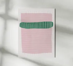 Uno sfondo rosa rettangolare presenta un motivo di sottili linee orizzontali, con una fascia verde di forma irregolare che attraversa il terzo superiore della composizione, segnata da strisce verticali. Lo stile minimalista e le forme astratte creano un senso di equilibrio e semplicità.